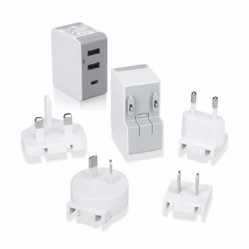 USB-C wall chargers with interchangeable US/UK/EU/AU plug heads. Built for telecom and OEM programs. MOQ from 1,000.